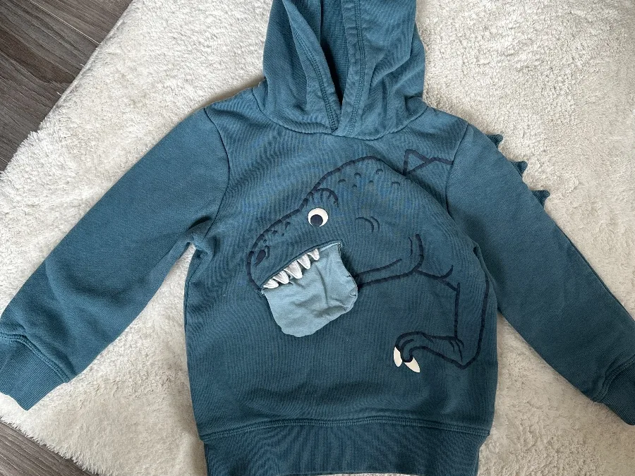 Dieser C&A Hoodie in Petrolblau ist mit einem coolen Dinosaurier Motiv versehen. Er ist aus einem angenehmen Baumwollmischgewebe gefertigt und befindet sich in einem sehr guten Zustand.
