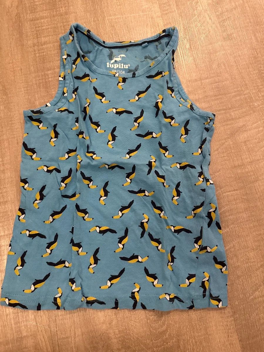 Dieses süße lupilu T-Shirt ist hellblau mit einem fröhlichen Tukan-Muster. Es ist in gutem Zustand und perfekt für warme Tage.