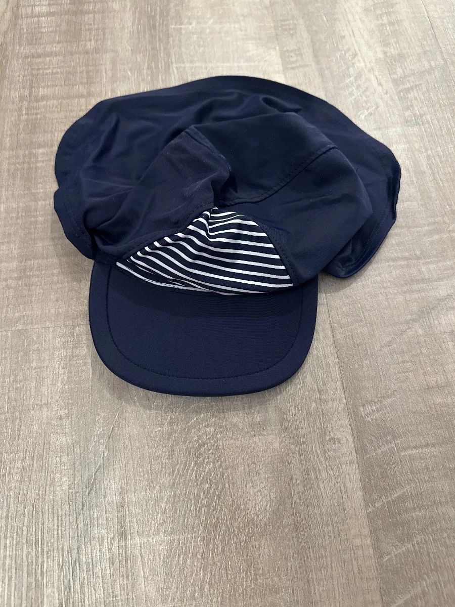 Diese alive UV-Schutz Mütze ist in Dunkelblau gehalten und besitzt ein maritimes blau-weiß gestreiftes Muster. Das schnelltrocknende Material ist ideal für den Strand oder Pool und bietet zuverlässigen Sonnenschutz. Die Mütze befindet sich in sehr gutem Zustand.